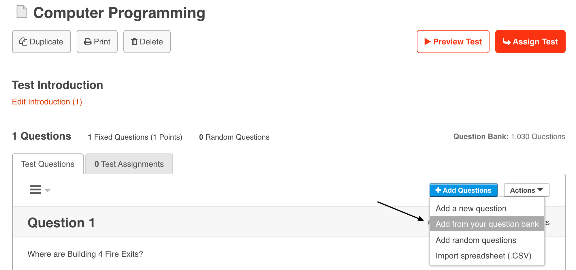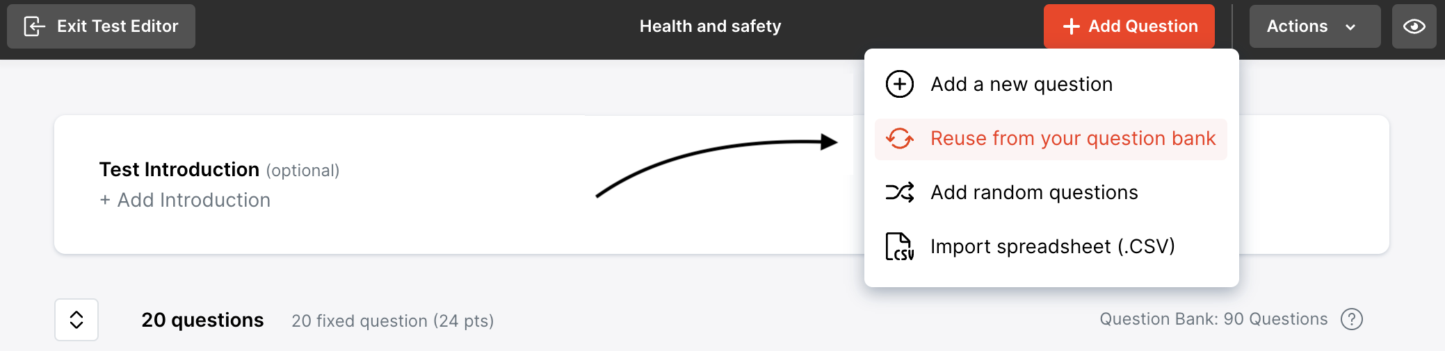 Now, on the Edit page, hover over the Fixed Questions button and select the 'Add From Question Bank' option.