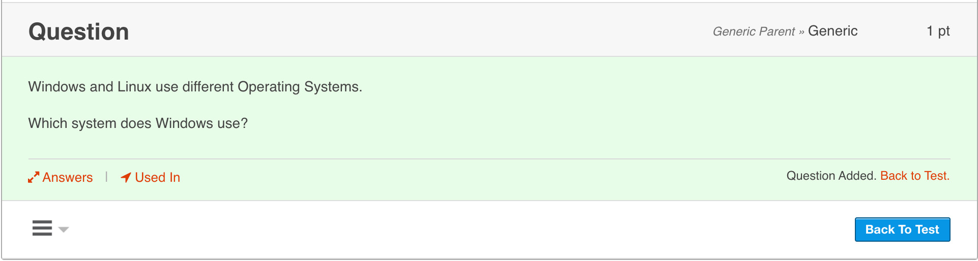 Congratulations! The Question's background has turned green to confirm that it has succesfully been added to your Test or survey.