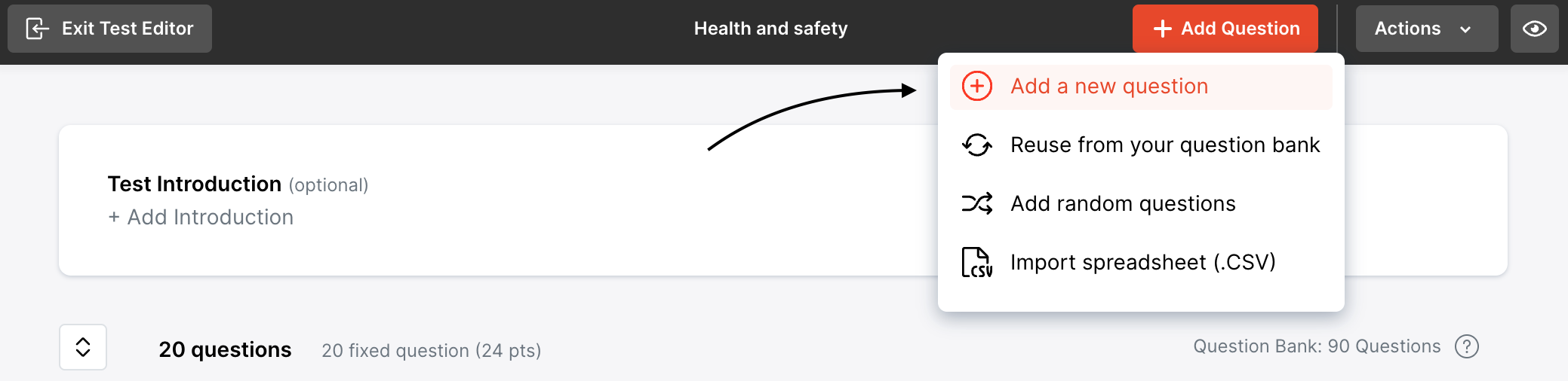 You can add new Questions directly to your Questions bank OR when adding new Questions to Tests or surveys. These Questions are automatically added to your Question bank for you.