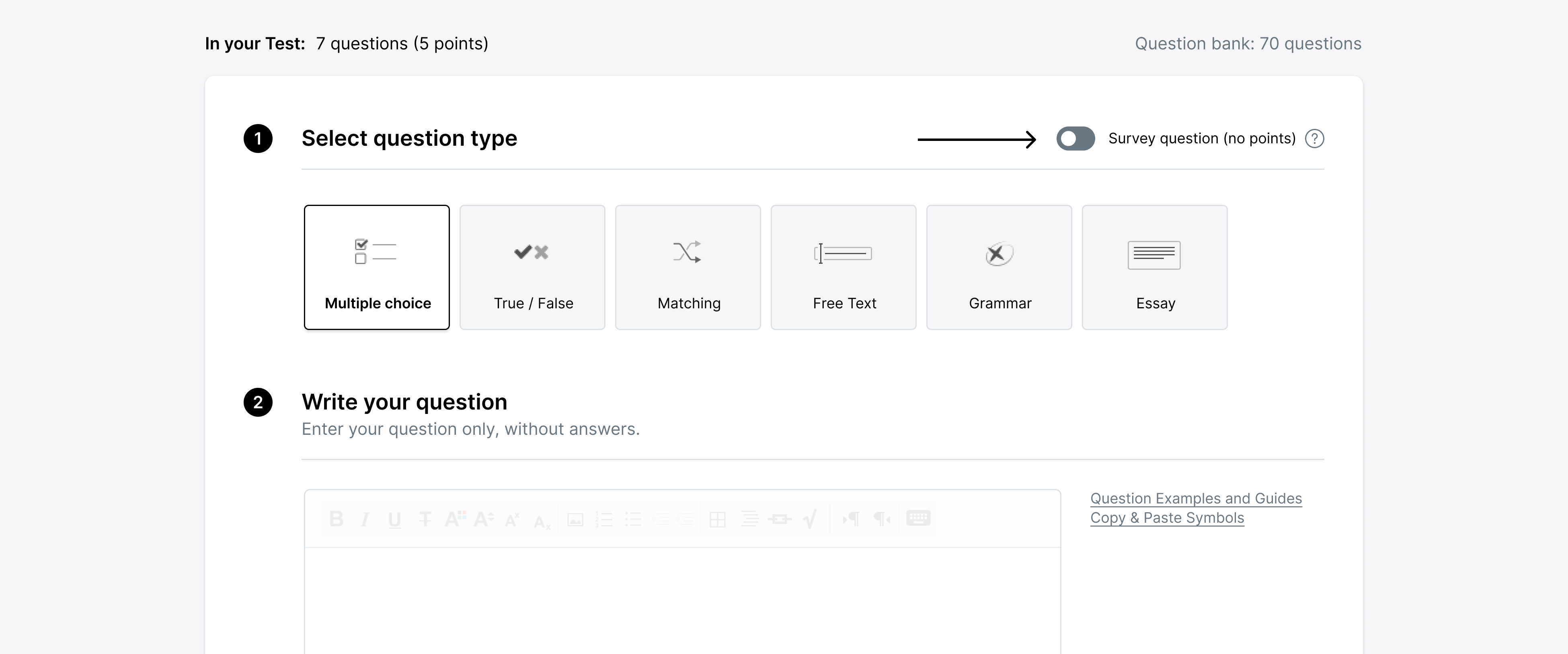 If you want to create a survey question simply toggle the switch at the top of the question editor to create survey questions.