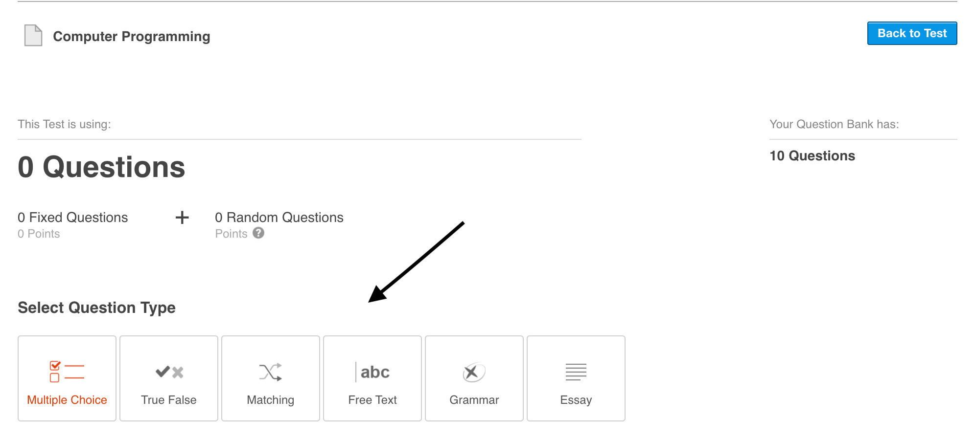 Select your Question type; Multiple Choice, True / False, Matching, Free Text, Grammar, Essay or survey.