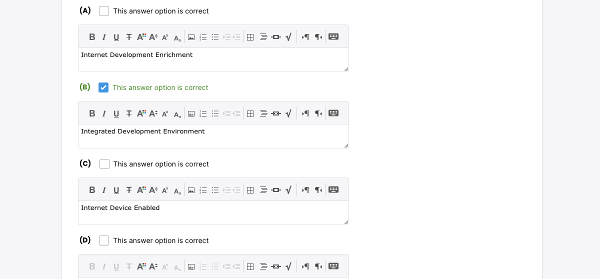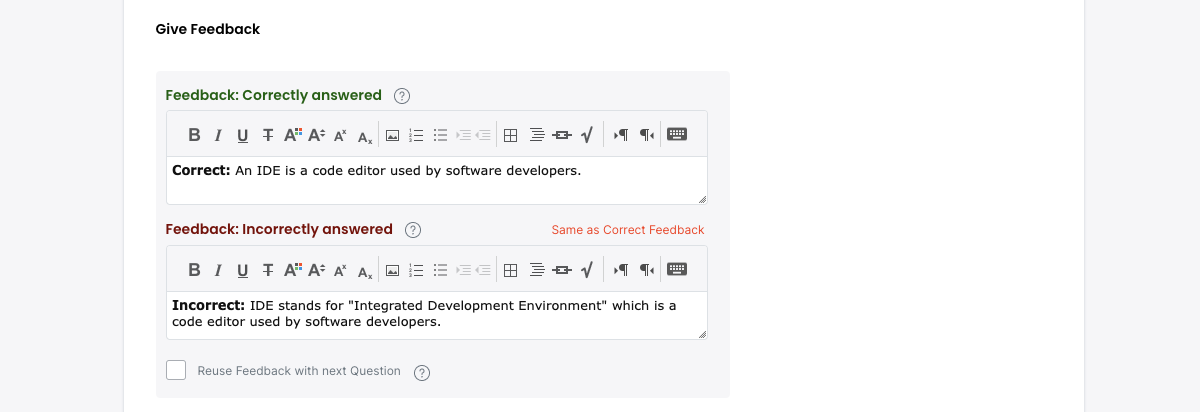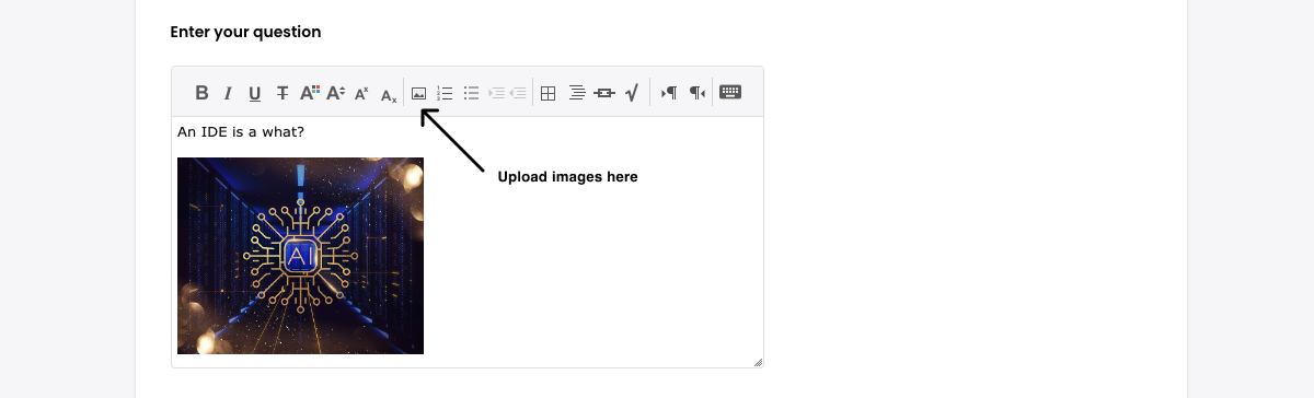 Enter your Question; You can format your text by using the Rich Text Editor and also add Documents, Images, Audio and Video files to your Question.