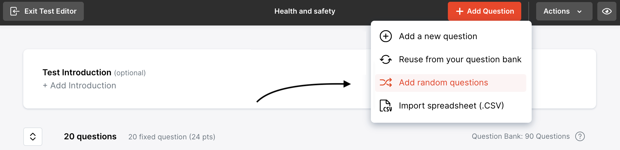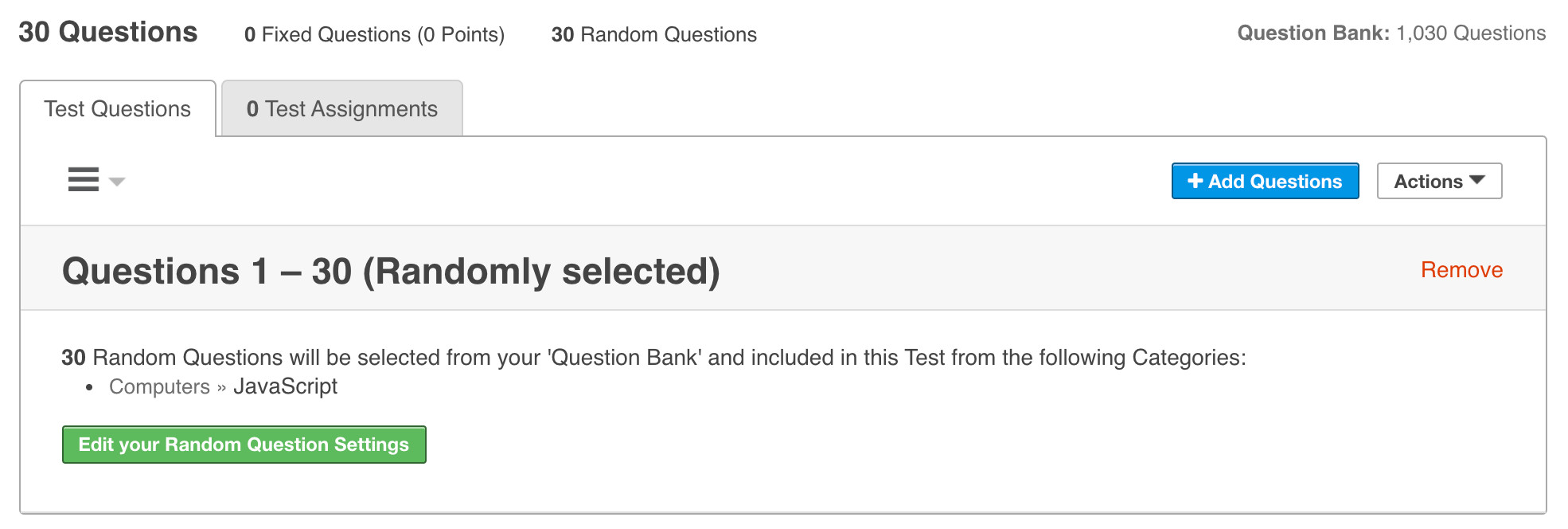 Randomly selected Question settings allow you to create a Test or survey that pulls Questions randomly from your Question Bank. This removes the need to pre-define exactly what Questions will be displayed.