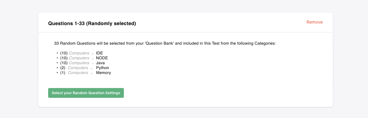 Define a specific number of Questions per selected Category and choose how you'd like your Questions to be ordered.