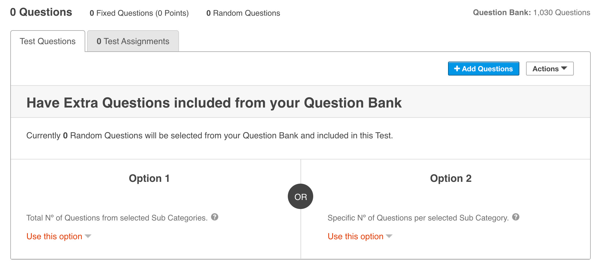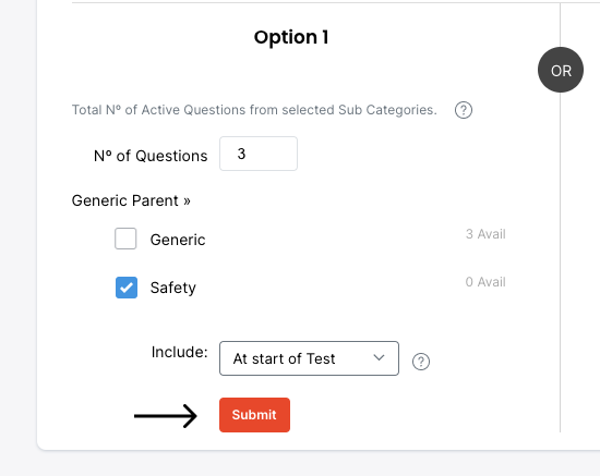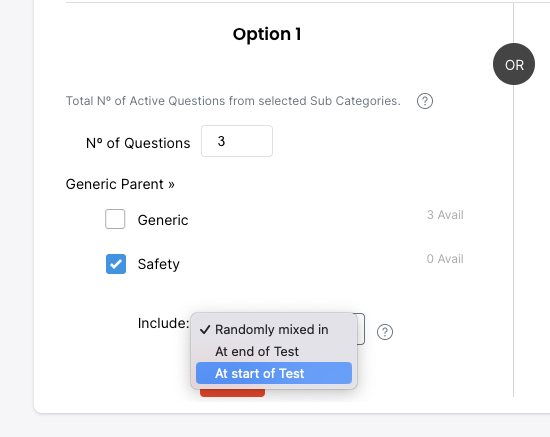 Option 1 allows you to select Categories and the overall number of Questions to be Randomly selected.