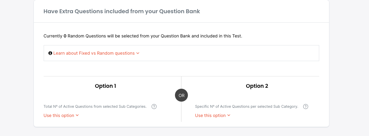 This is because, 'Fixed Questions' will always be given with your Test or survey, but are not required if you only want to have Randomly Selected Questions used.
