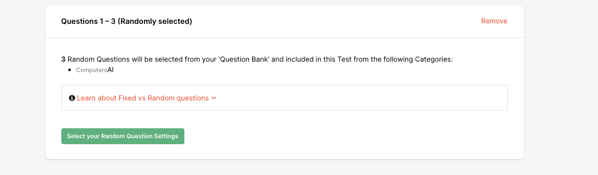 Important Note: If you only want 'Randomly Selected Questions' to be given, then remove any 'Fixed Questions' you may have in your Test or survey.