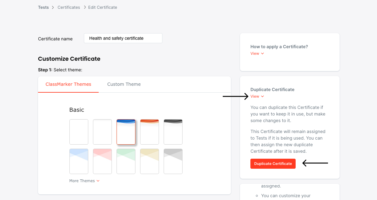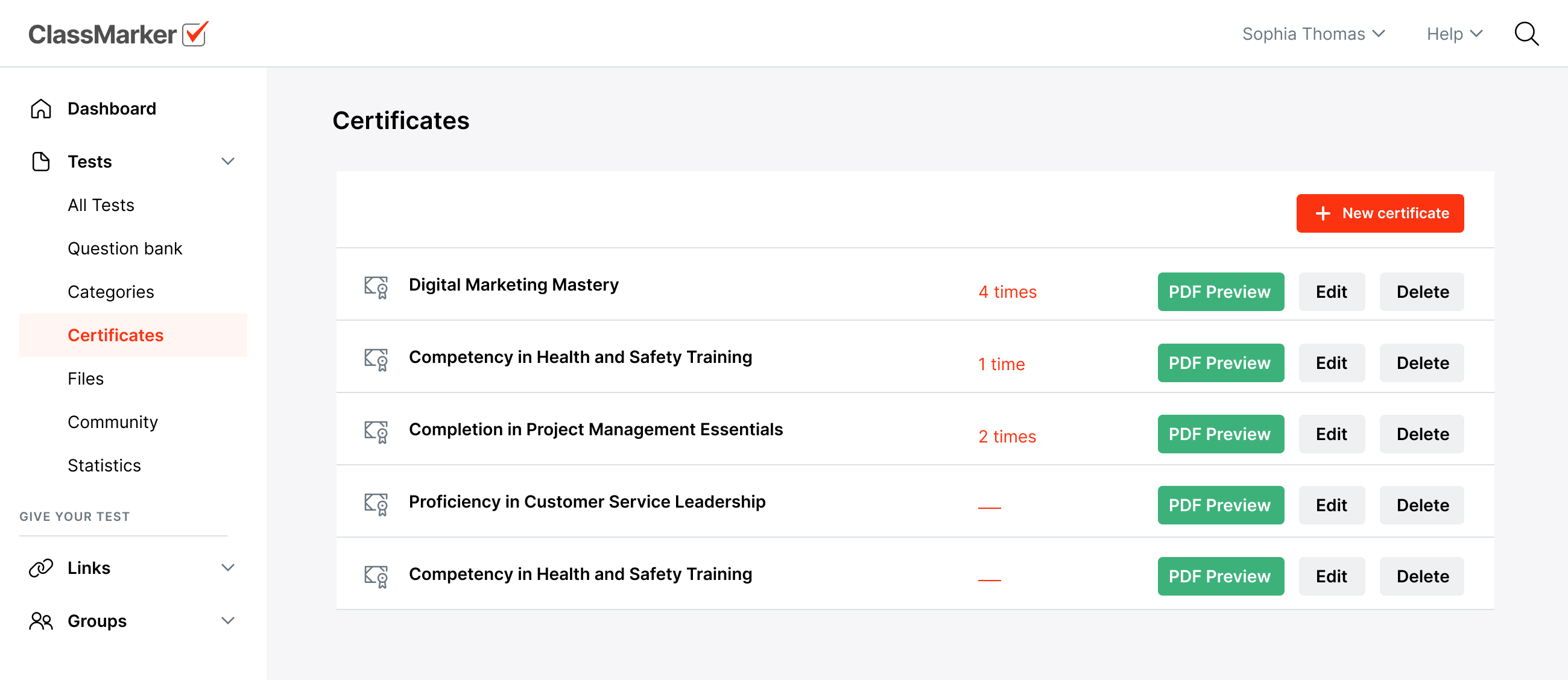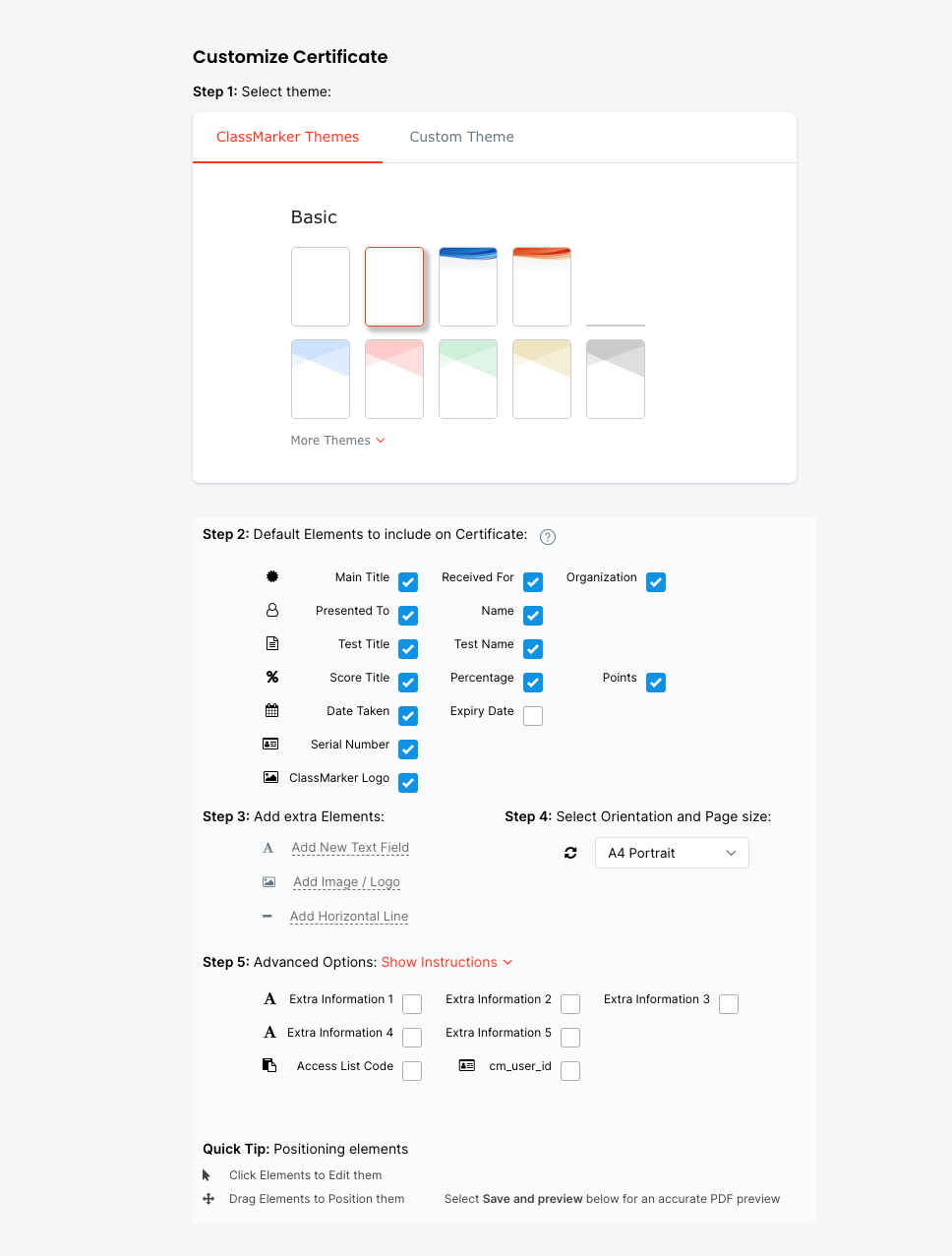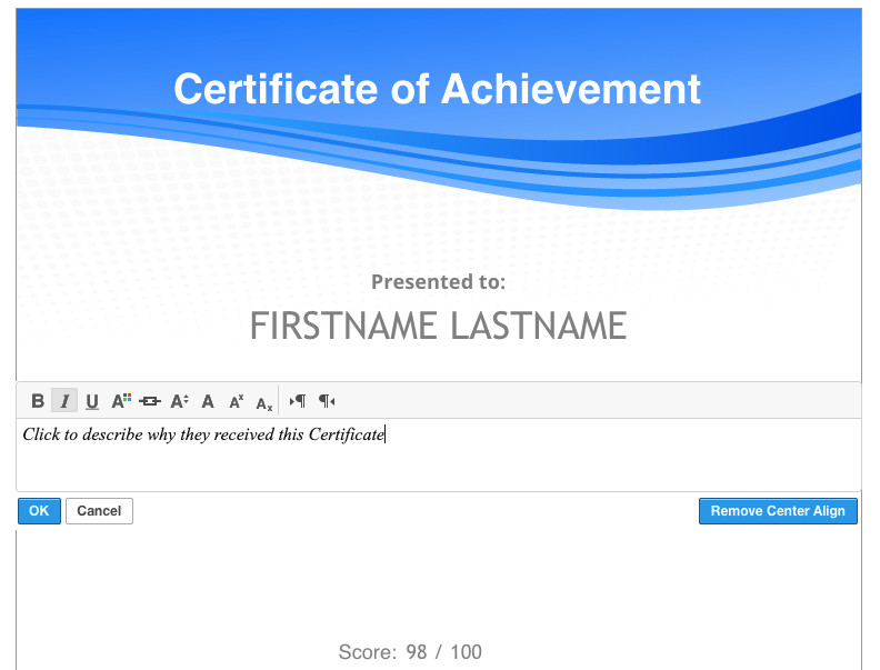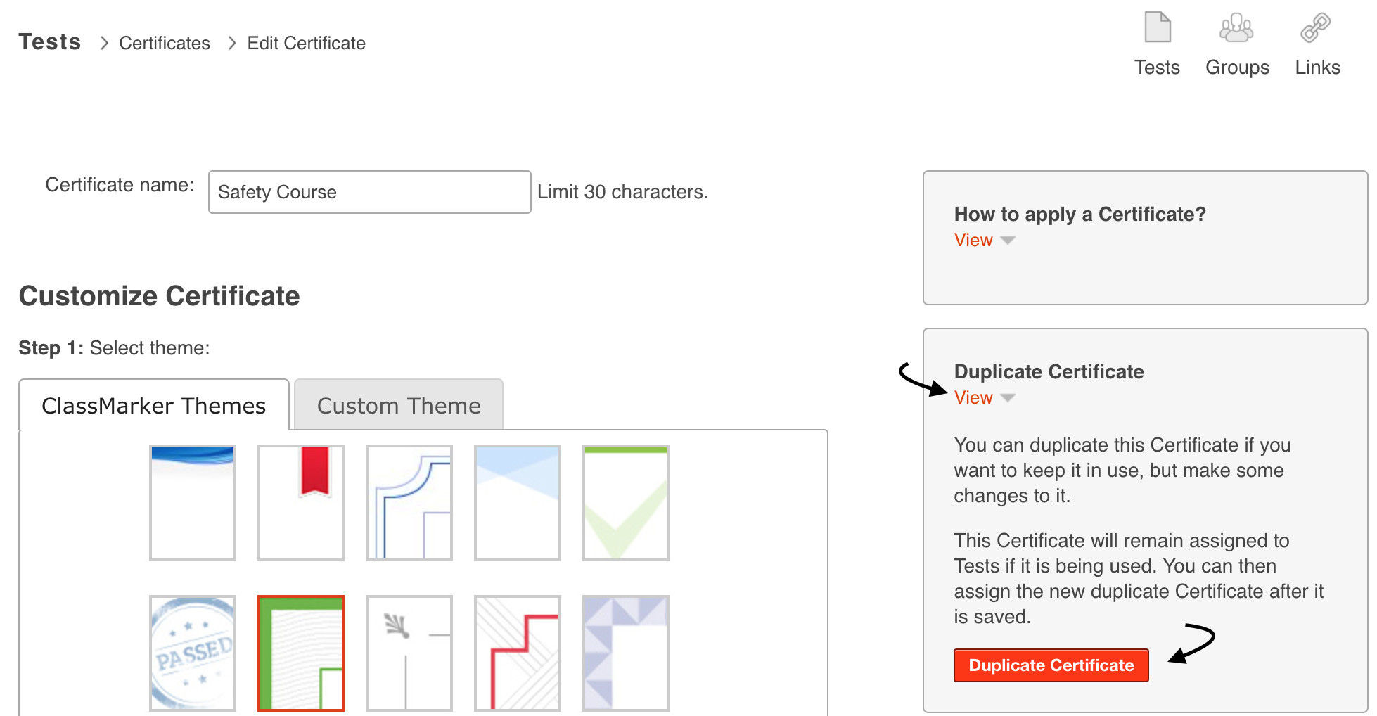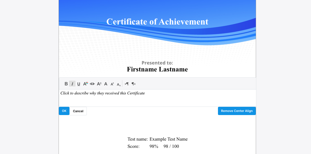 ClassMarker allows you to create custom Certificates to be displayed at the completion of your Test/s or survey/s.