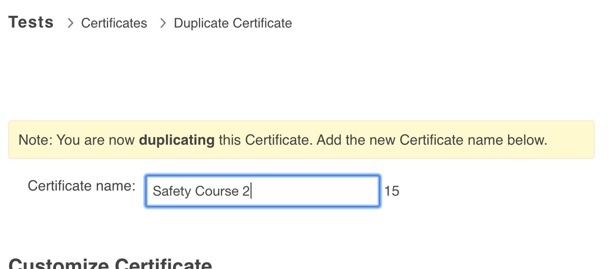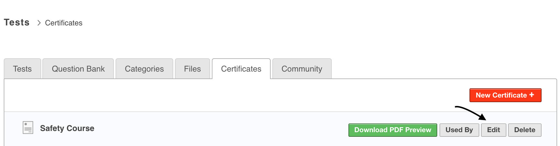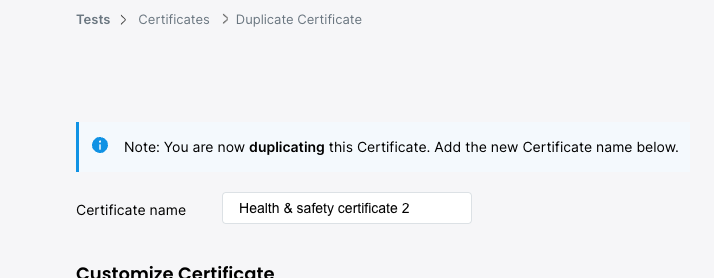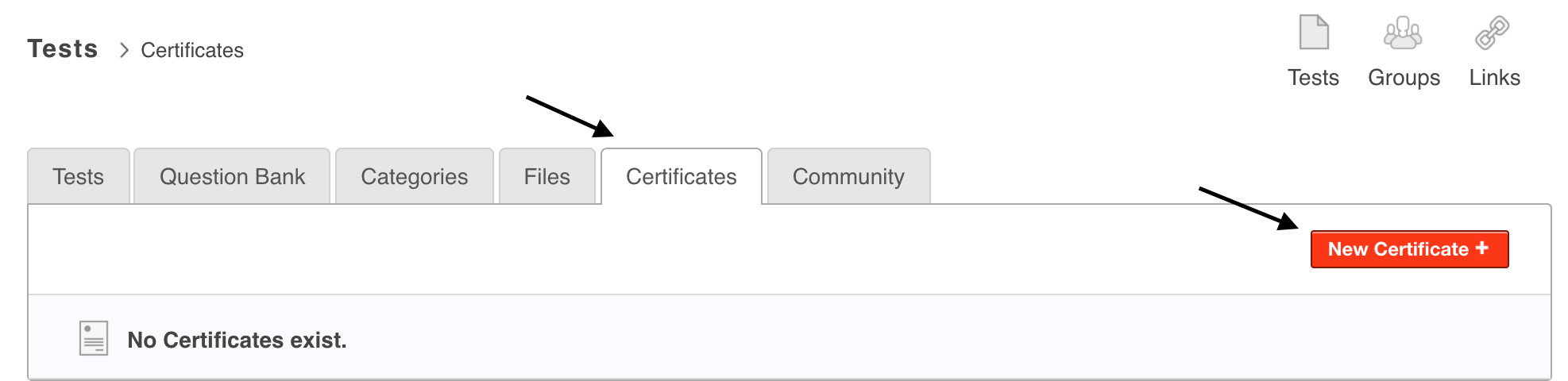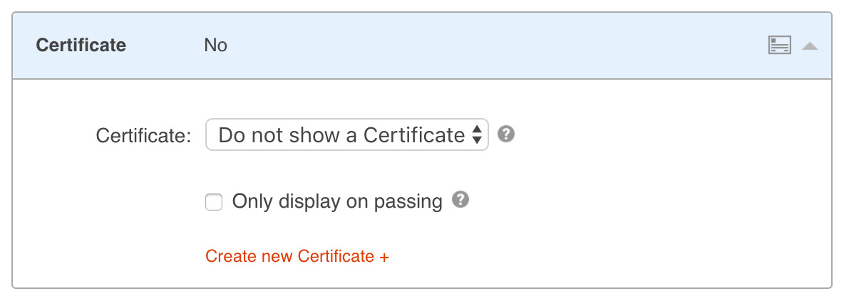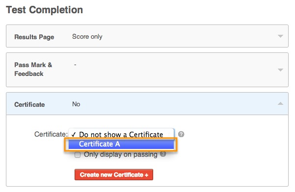 When you assign (distribute) your Test or survey, you can choose whether you'd like to include a Certificate. You can also define whether the Certificate will be displayed to all users upon completion, or if the Certificate should only be displayed if the user achieves a pass grade (the pass grade for tests is also defined by you).