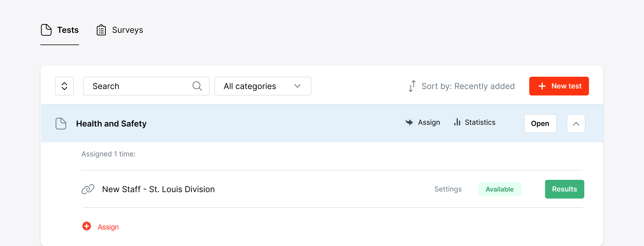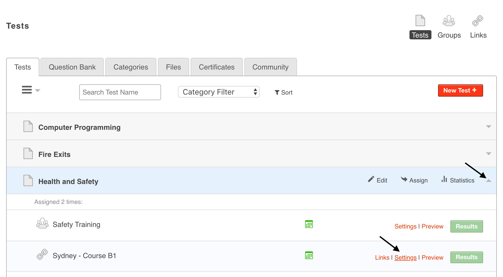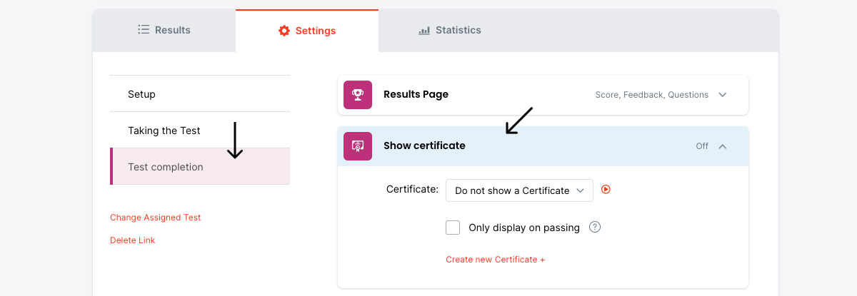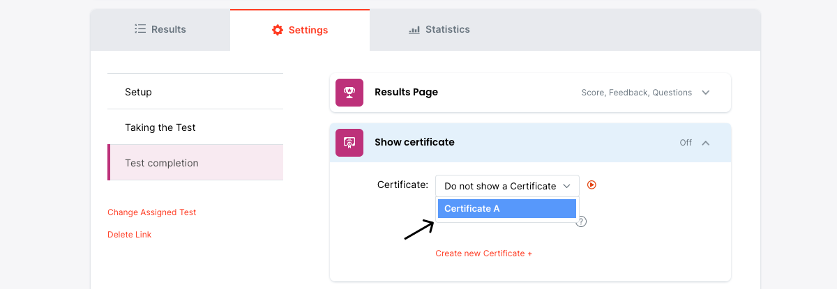Go to the Tests section and select 'Settings' for the assigned Test or survey you wish to show the Certificate.