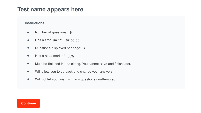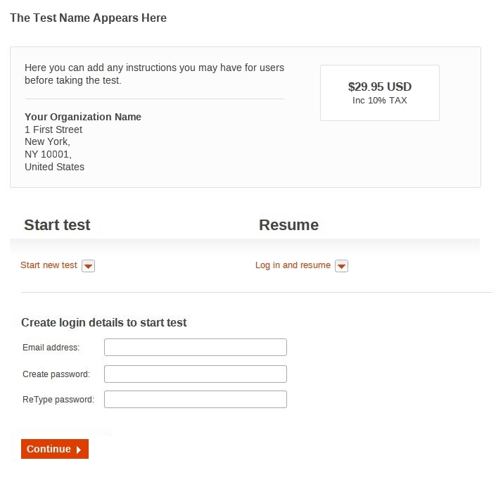 If multiple attempts are allowed, Test takers can go to the Test Link again and use the Email and Password they registered on the "Test start page" to resume another attempt.