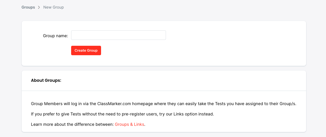 Group members will log in via the ClassMarker.com homepage where they can access Tests or surveys you have assigned to their Group.