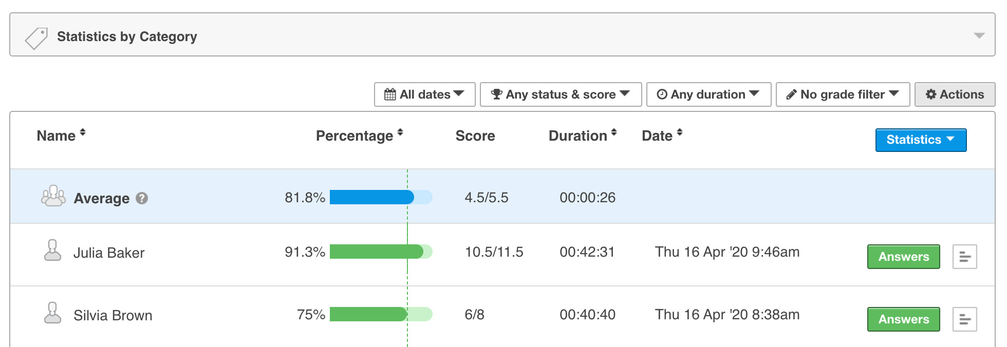• By Test, group, link, question category, or user
