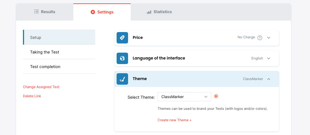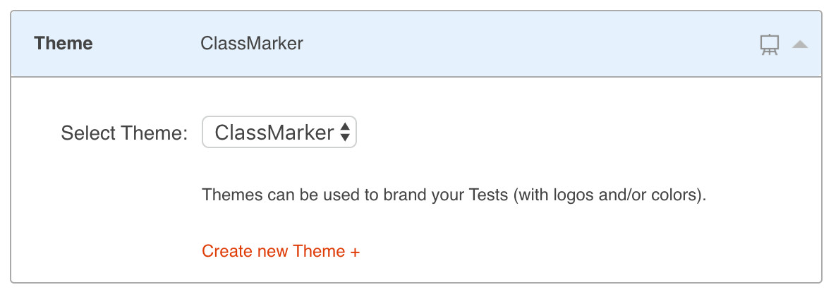 Use this setting to apply a Theme to your Test or survey. This enables you to remove ClassMarker branding and apply your organization's own logo and colors.