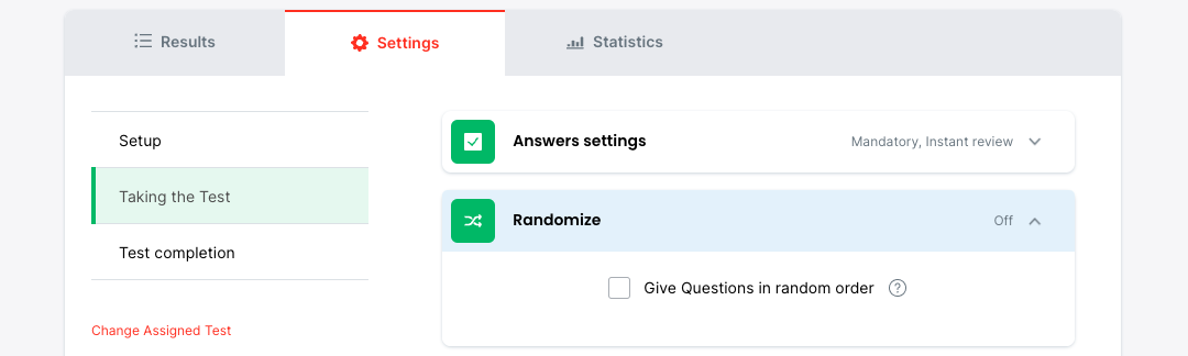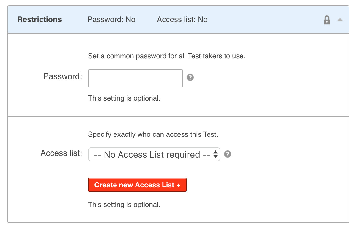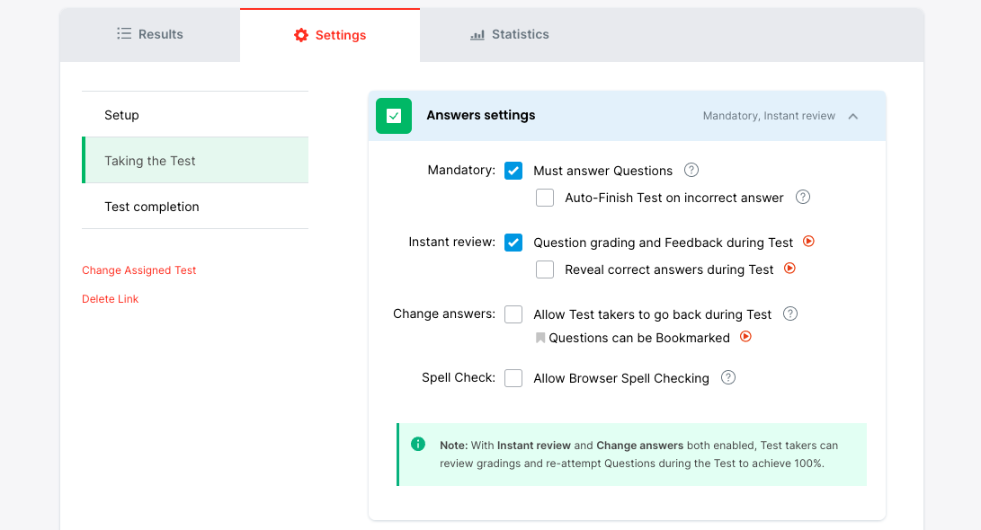 Test settings are chosen when a Test or survey is being assigned (distributed) to a Group or Link. These settings define how Tests/surveys are accessed by users.
