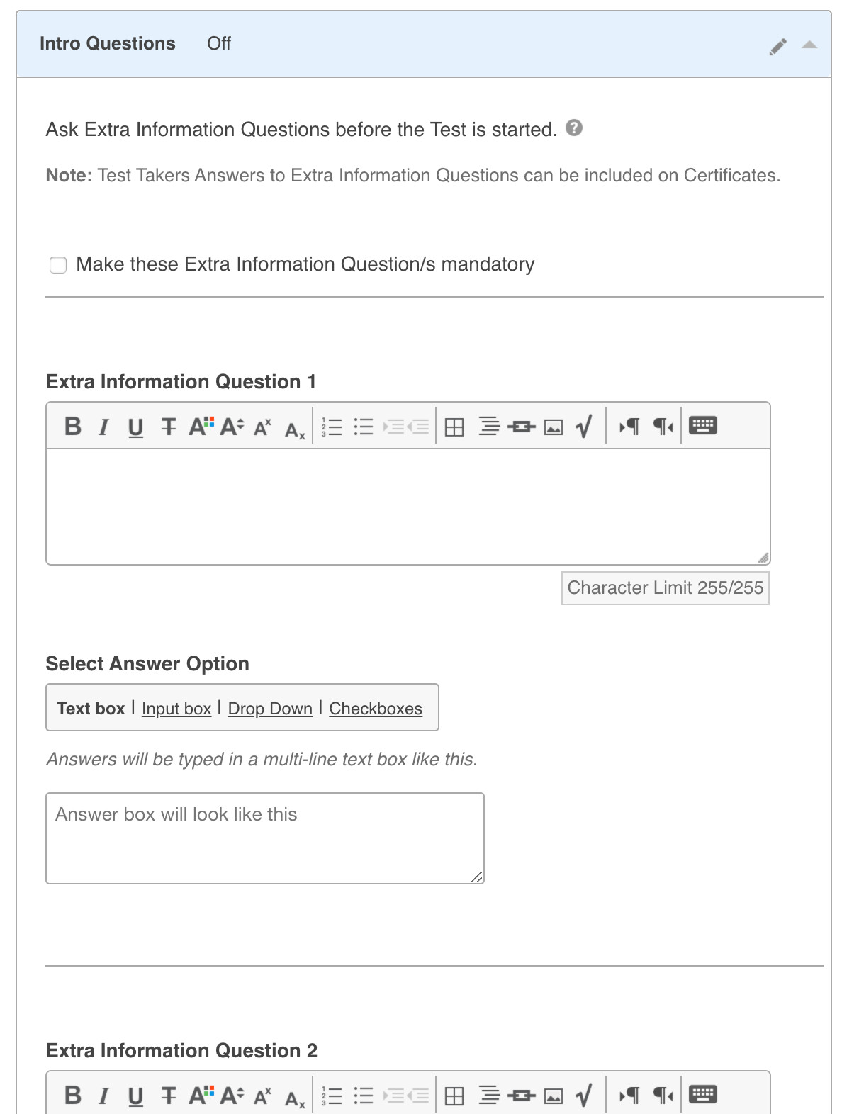 Note: There is a maximum character count of 255 for both Question and answer fields and there is a maximum of five 'Extra information Questions' available.