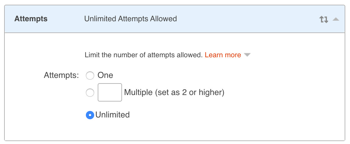 Define how many times each user can attempt a Test or survey. Note: If a Test includes Essay Questions a new attempt cannot be started until the previous attempt has been graded.