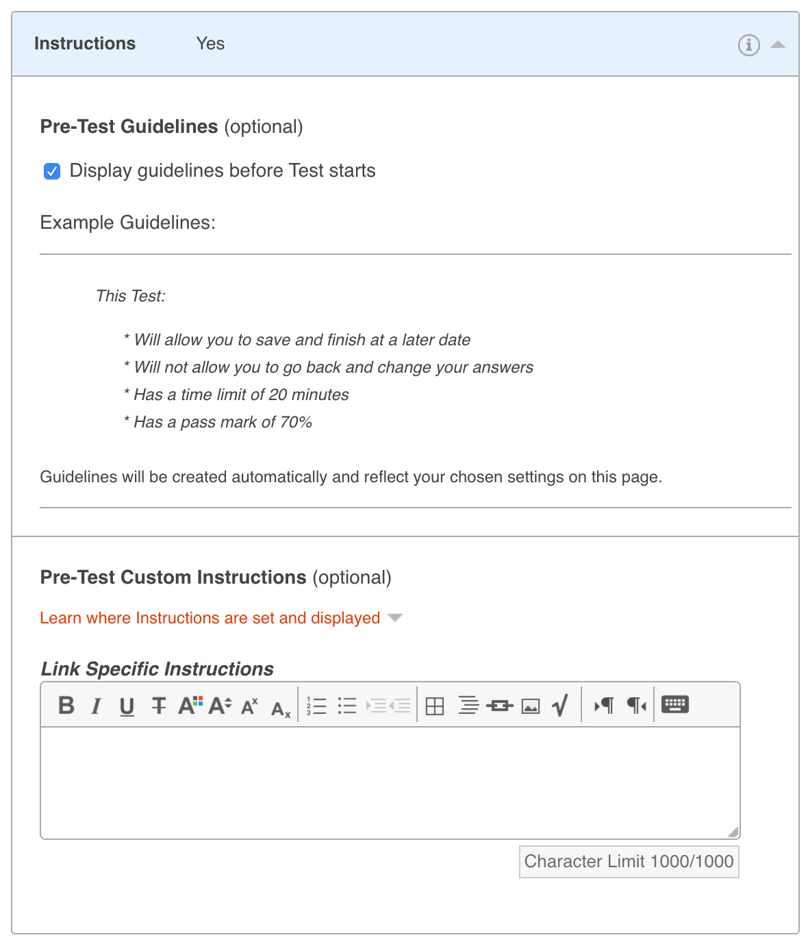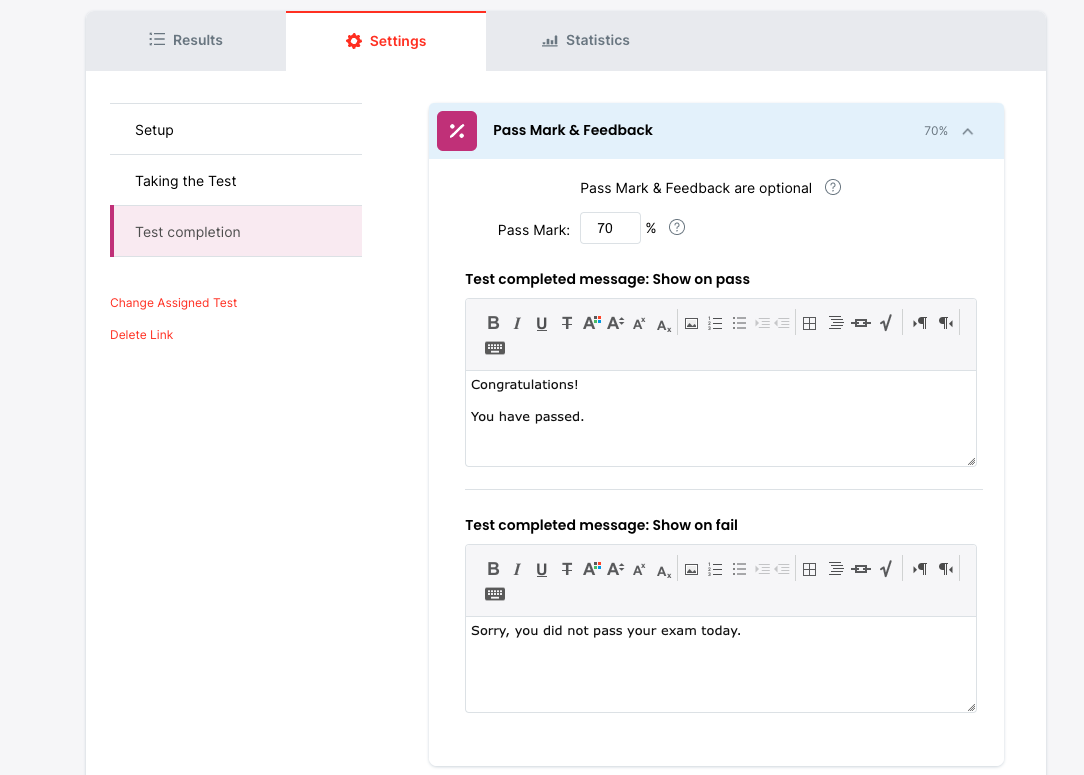 Define what grade must be achieved to pass the Test. Then enter feedback to be displayed for Pass or Fail marks.