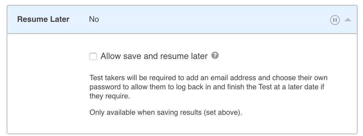Choose whether users are allowed to save their progress in the middle of an attempt and then come back at a later stage to complete their Test or survey.