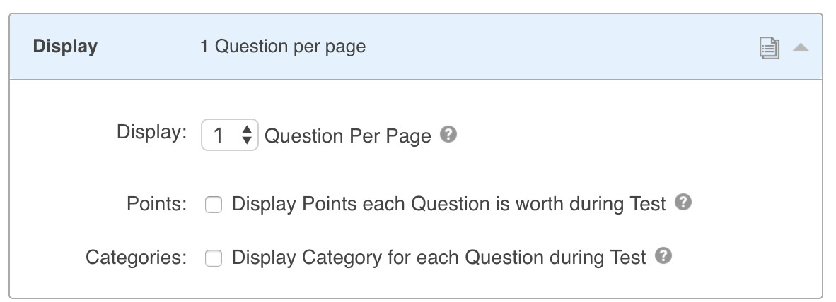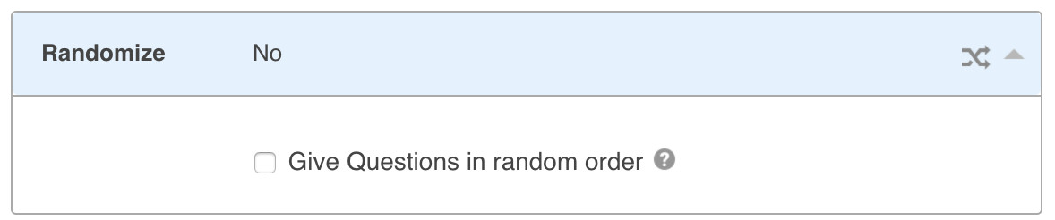 Choose for Questions to be displayed in random order each time a Test is taken. Useful for cheat prevention. Please note: Although randomization is available for surveys, it is recommended for tests.