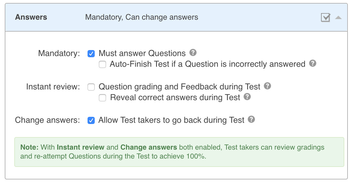 Note: You can also have Questions selected at random from your Question bank each time your Test is taken, see Randomly selected Questions