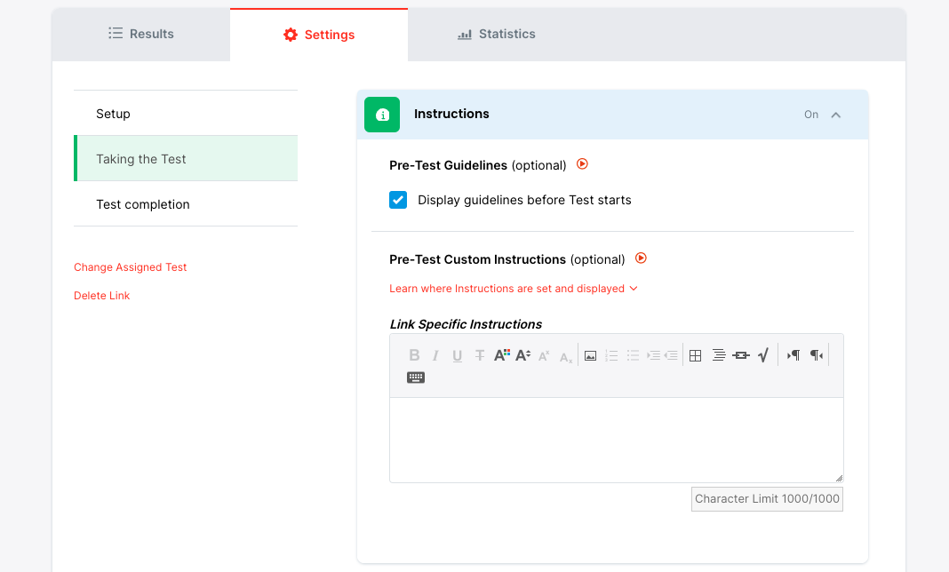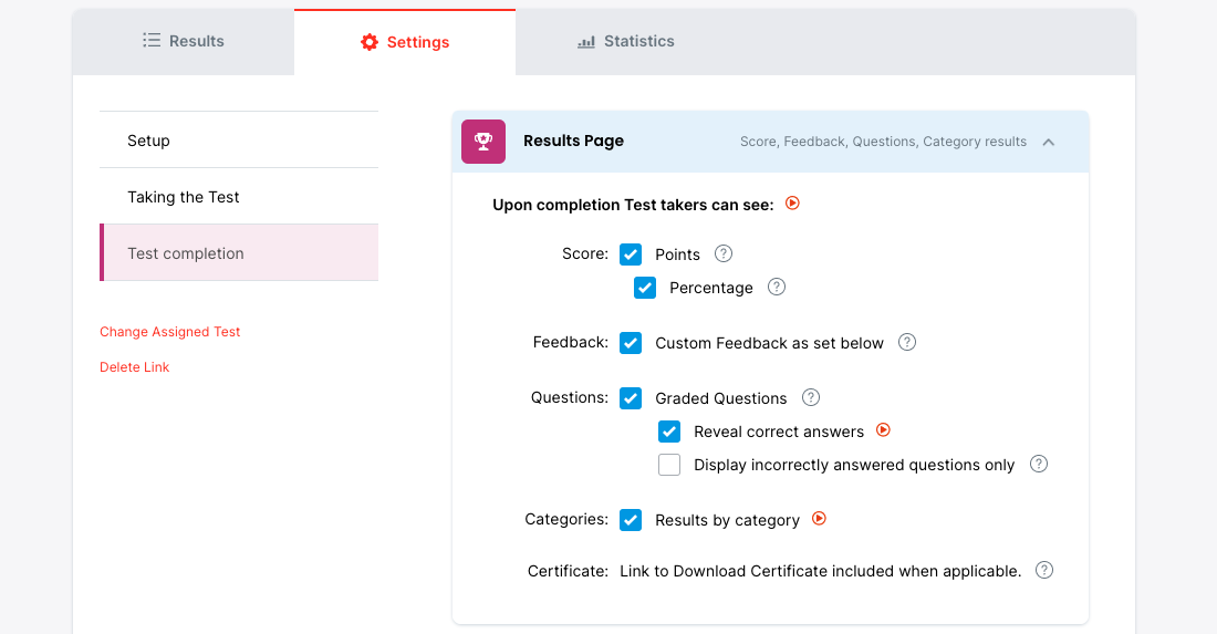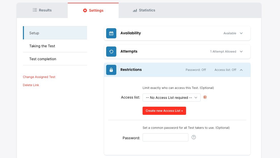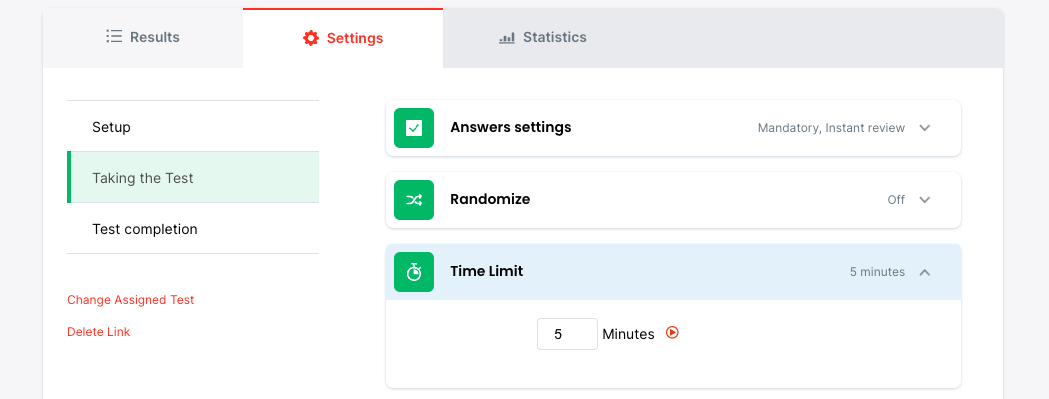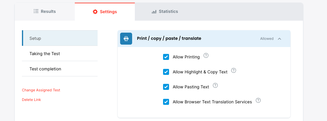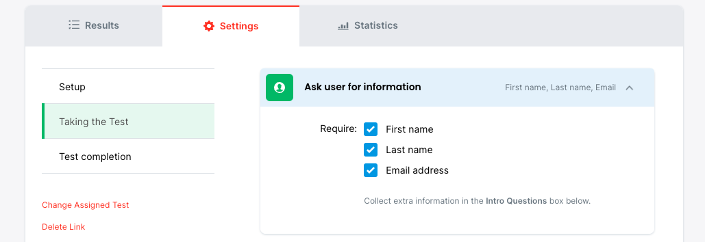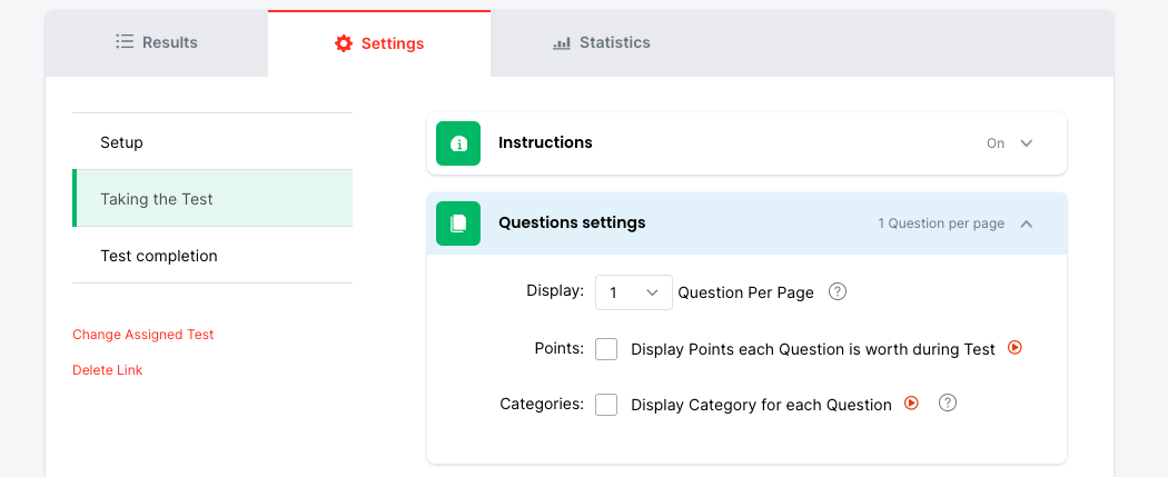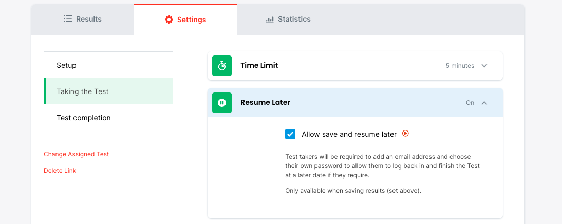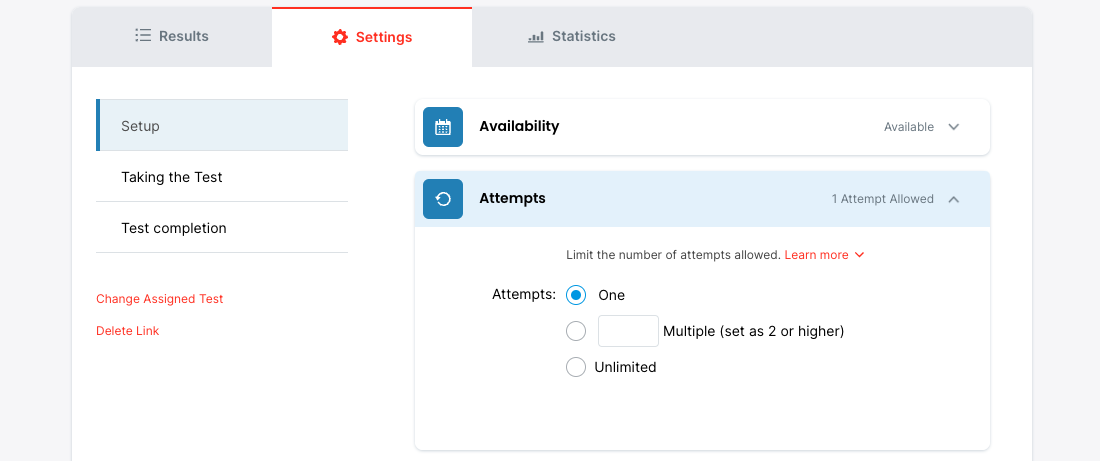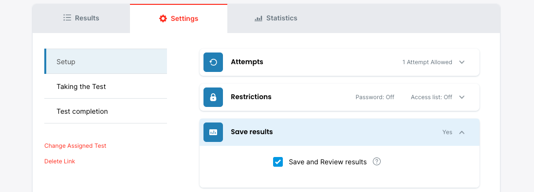 Tests/surveys assigned via Link have a few additional settings that can be defined to meet your requirements.