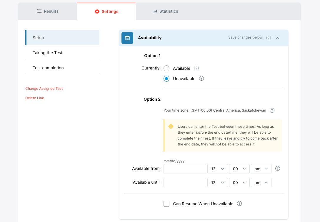 Define when users are able to access your Test or survey. Make them Available or Unavailable, or set a specific date range.