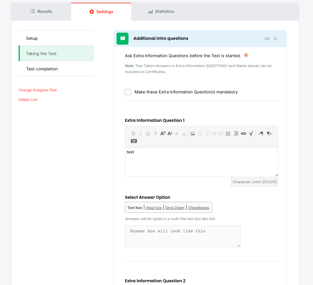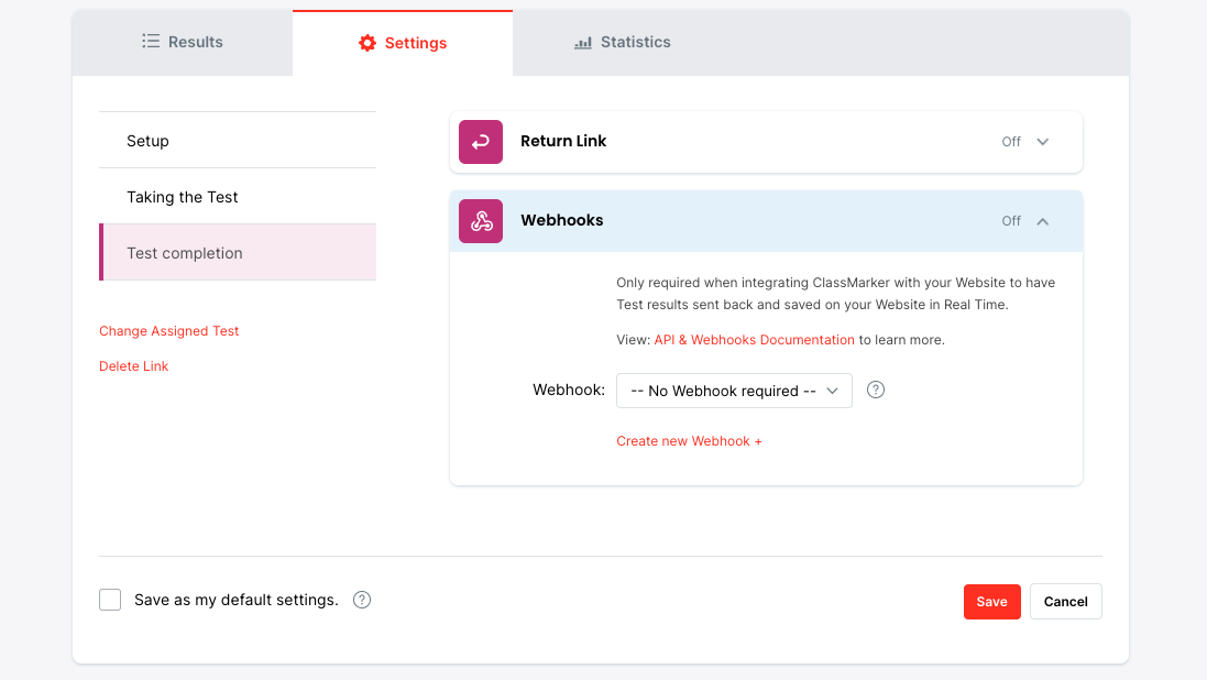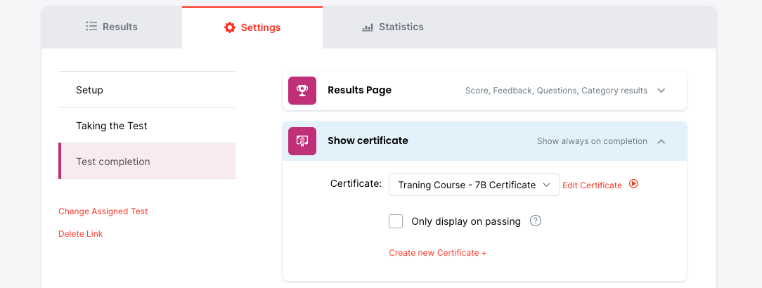 Note: For Tests assigned via Link you can also include Return Links - a URL to direct the user to another web page (for example, your website, or perhaps a resource website for users who fail the Test).