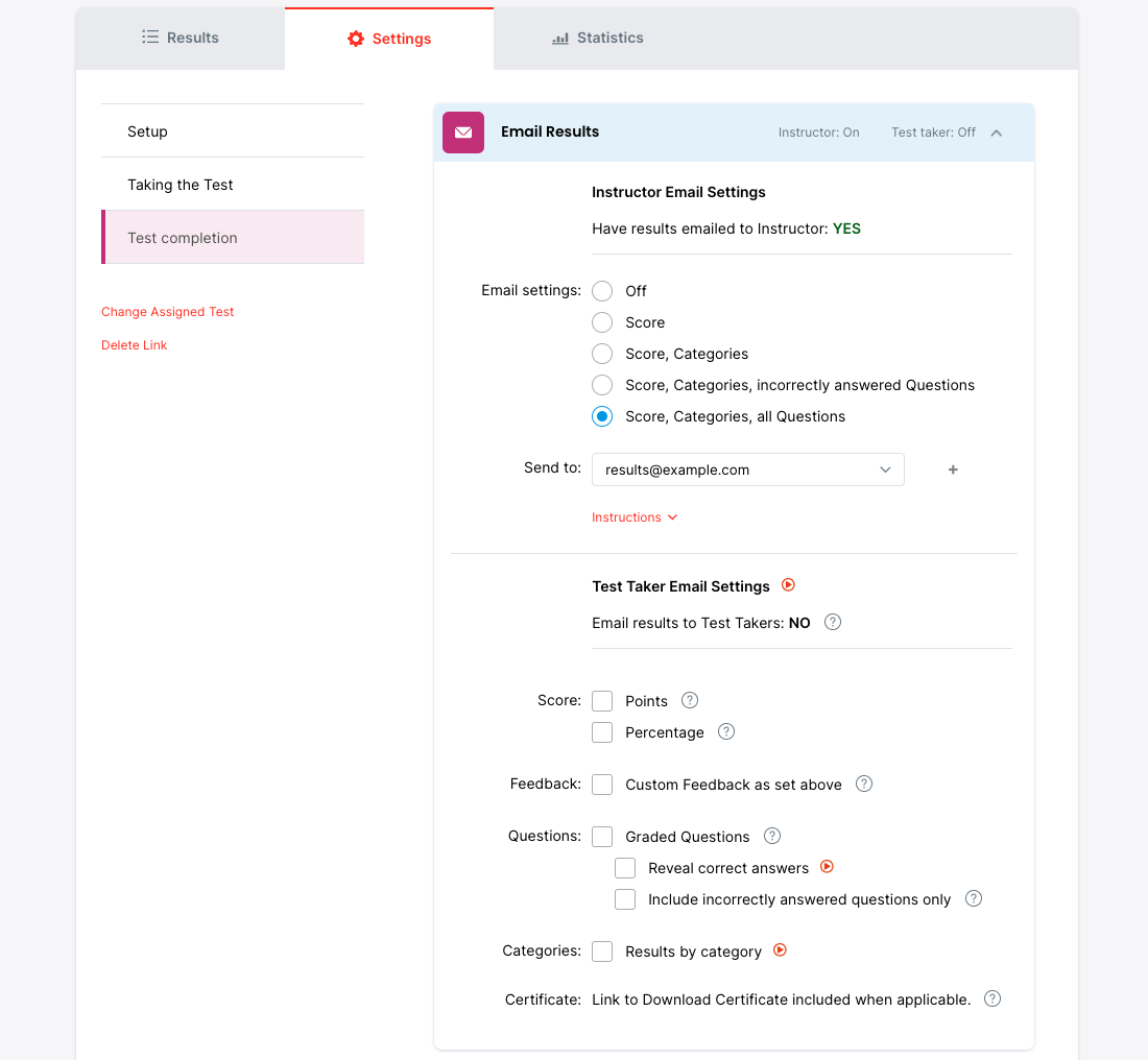 For Tests assigned via Link you can also choose to send results to other email addresses. Manage these addresses under the My Account page. Once the 'Extra email addresses' have been verified they will appear under this setting.