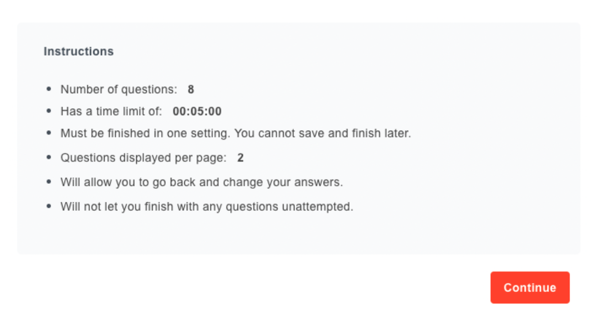 Users will see Test settings and instructions as set by you. Instructions can be set in multiple languages and you can add your own custom instructions as well.