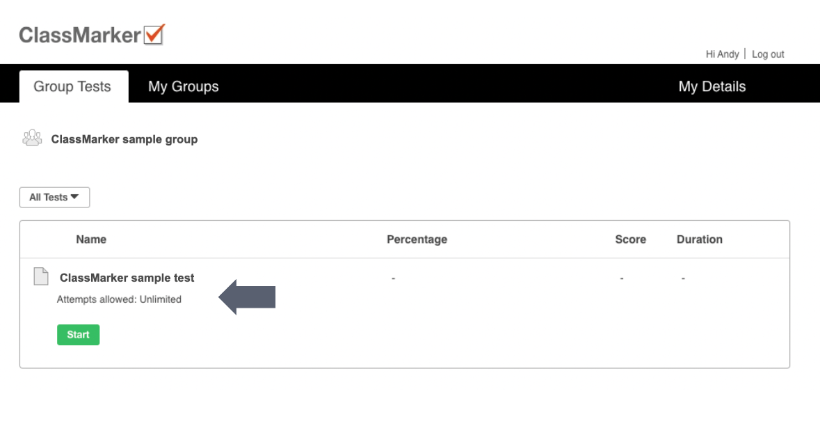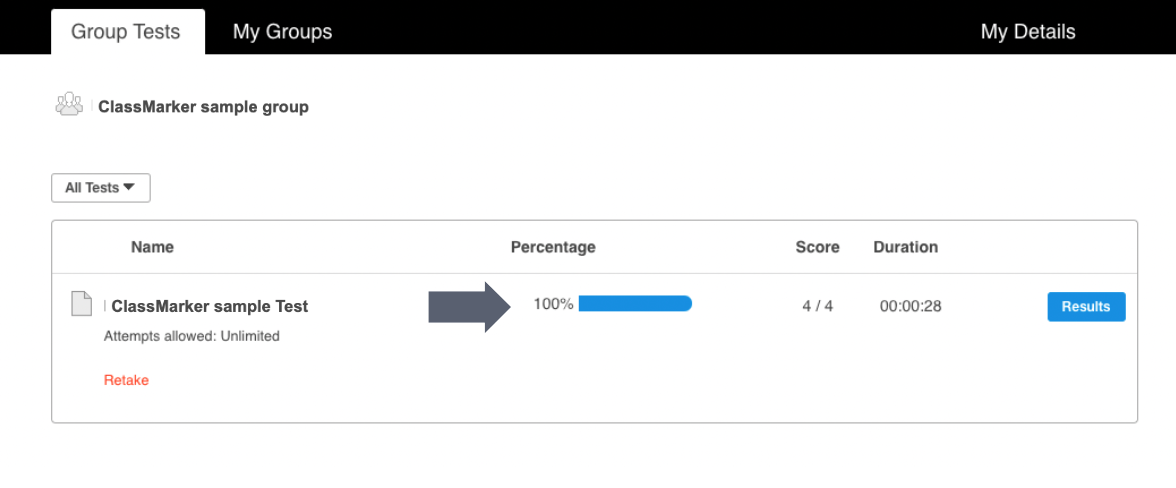 Students registered into groups have an account where they can see all Tests assigned to them.