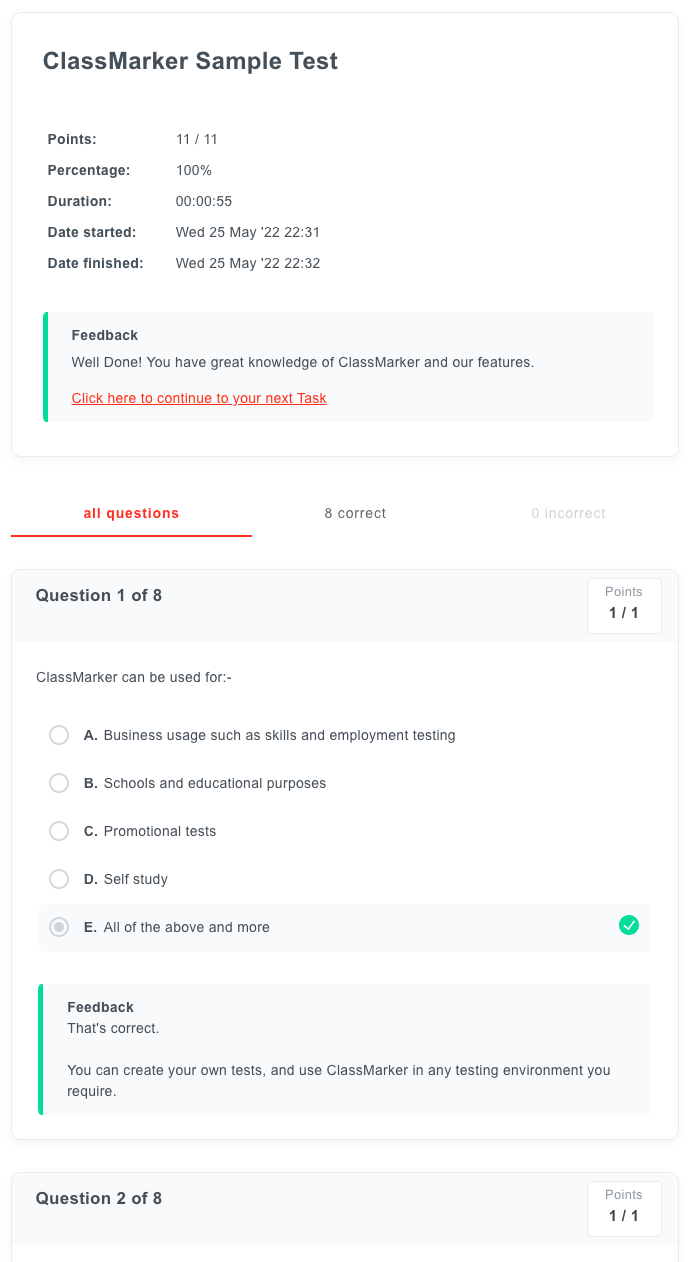 We routinely survey test takers for feedback. The majority praise ClassMarker's fast, easy-to-use test-taking platform, automatic exam scores, and the ability to receive instant feedback on their results.